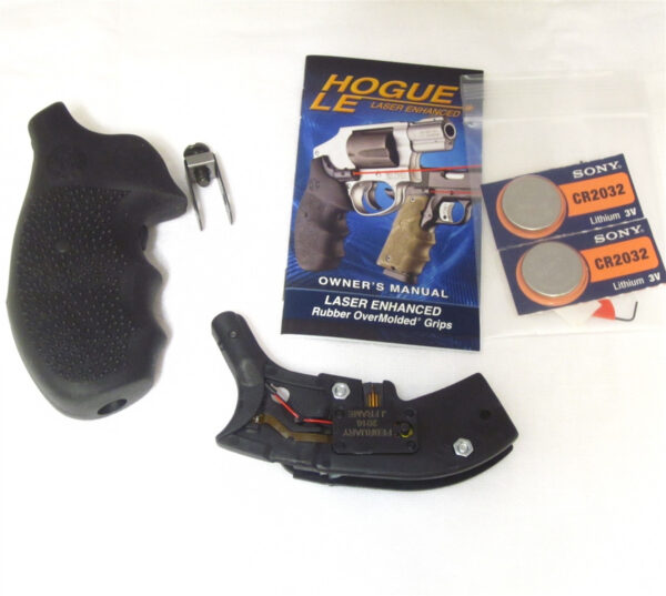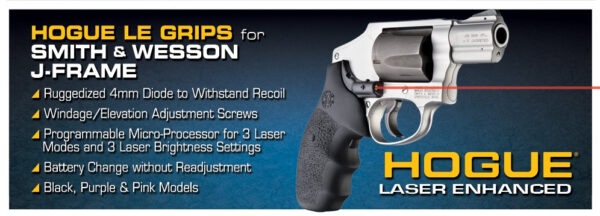 Laser Enhanced (LE) S&W J Frame Round Butt Grip, 3 brightness levels, Batteries in one panel opposite laser so no need to adjust laser after replacing batteries. Internal programmable microprocessor for Flashing, Stealth Target or Flashing Modes. 630-670 nm <5mw Class 3R Red Laser.