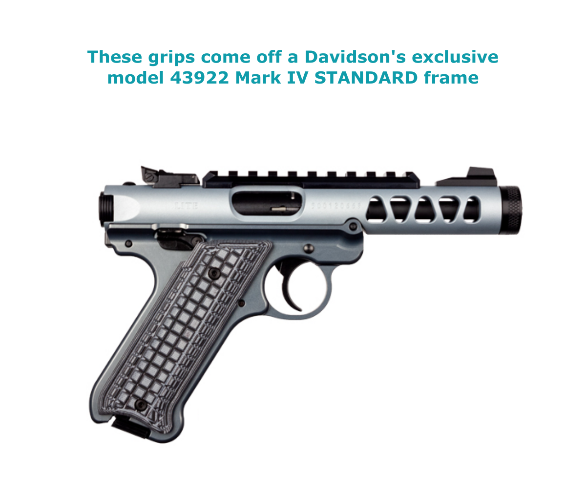 These are new take-off grips from model 43922 Davidson’s exclusive Mark IV LITES. They’re made by Pachmayr for FACTORY 43922 Mark IVs.