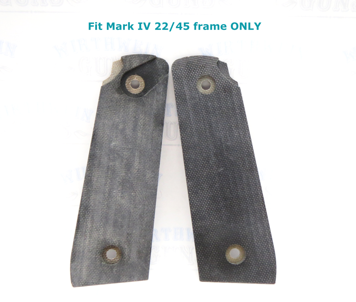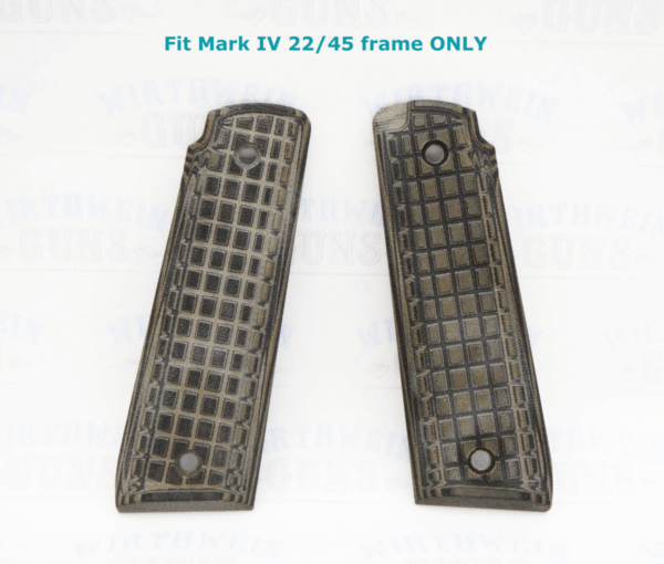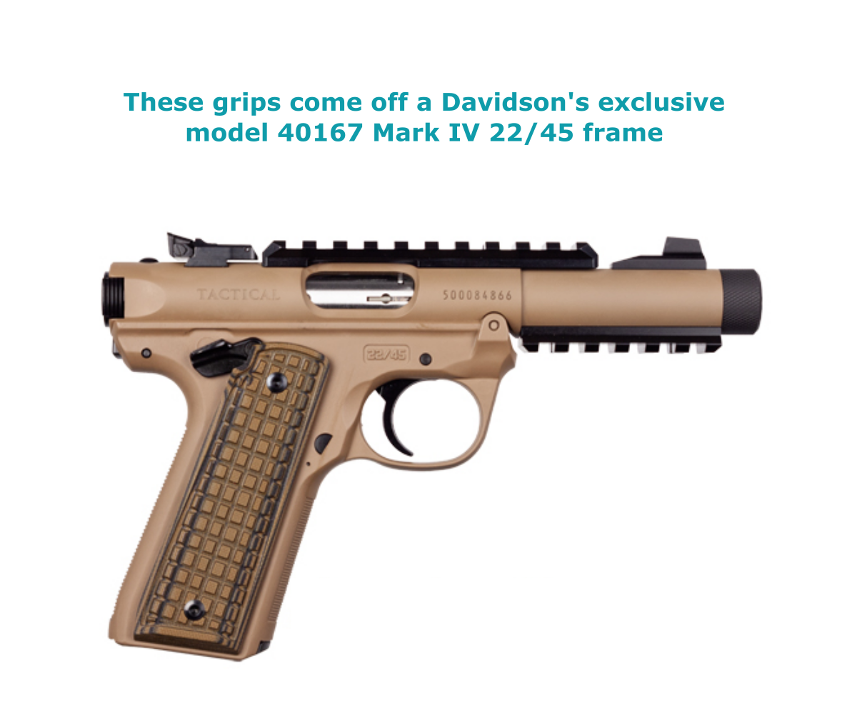 These are new take-off grips from model 40167 Davidson’s exclusive Mark IV 22/45 Tactical Davidson’s Dark Earth. They’re made by Pachmayr for FACTORY 40167 Mark IVs, although Pachmayr does not have a part number for these. The tan on these isn’t quite as vibrant as Davidson’s picture shows, it’s a little more subdued in person.