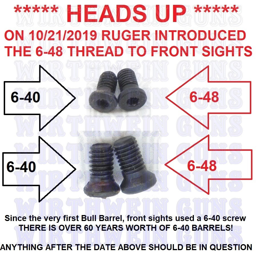 In October 2019 Ruger changed front sight screw size in all of the steel Mark Pistol barrels to 6-48.