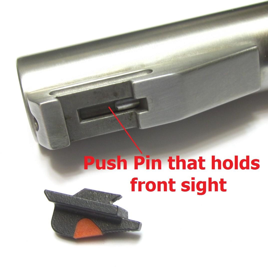 There will be a hole right above the muzzle that has a spring loaded plunger in it that holds the sight in place.