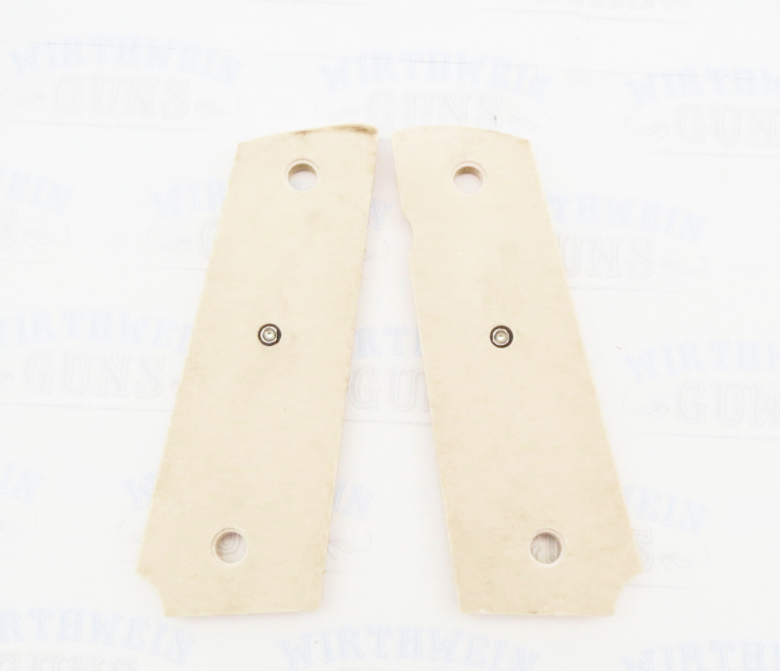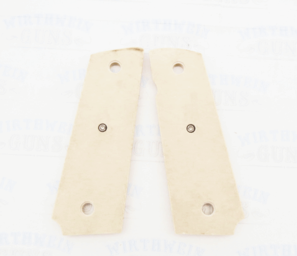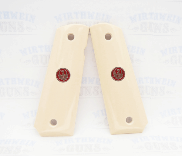 Ruger 1911 Bonded simulated ivory grips with the Ruger red medallion.