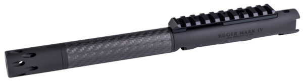 Each barrel is made from stainless steel and features a laser-hardened breech face for maximum durability even at extreme round counts exceeding 100,000. Their unique design utilizes a woven carbon fiber sleeve for rigidity while still providing an air space between the sleeve and barrel for heat dissipation. This barrel is then threaded into a Ruger MK IV upper receiver.